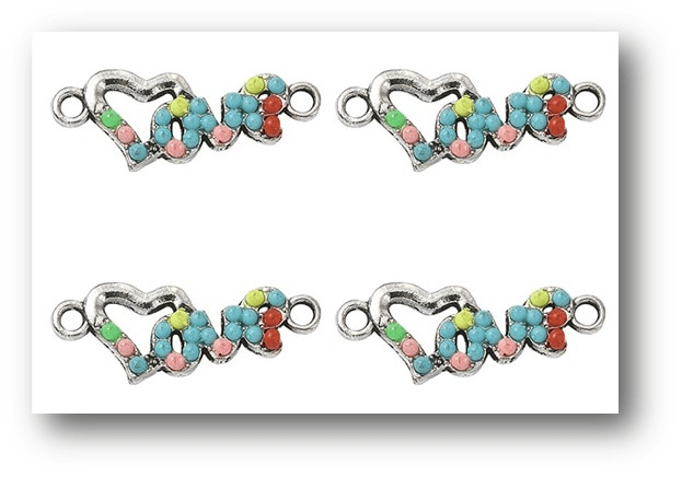 These are fun, colorful connectors with tiny glass beads that spell Love. Antique silver alloy with an unknown metal content. They measure approximately 25x10mm and are sold in sets of 2 connectors.